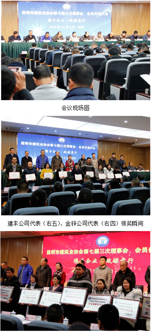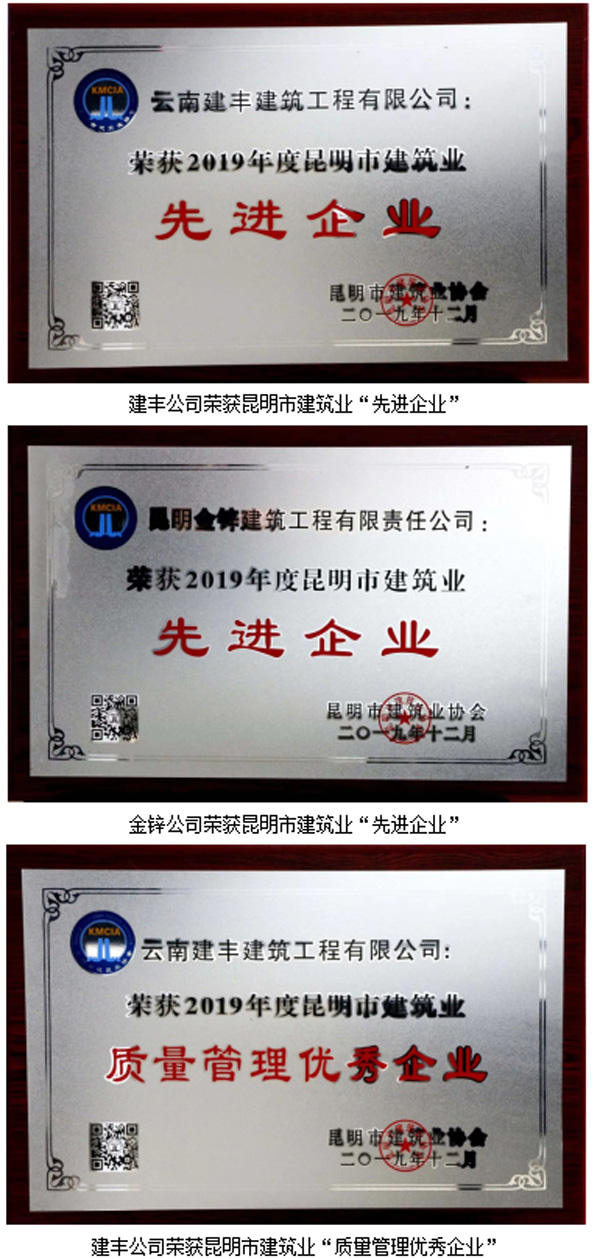 2019年12月5日,昆明市建筑業協會第七屆三次理事會、會員代表大會在昆明市建筑設計研究院報告廳舉行,俊發建設集團下屬子公司云南建豐建筑工程有限公司、昆明金鋅建筑工程有限責任公司兩家公司榮獲昆明市建筑業“先進企業”“質量管理優秀企業”稱號。