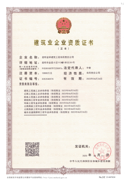 金鋅市政總承包一級資質證書正本