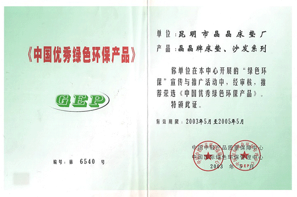 【晶晶床墊】2003中國(guó)優(yōu)秀綠色...