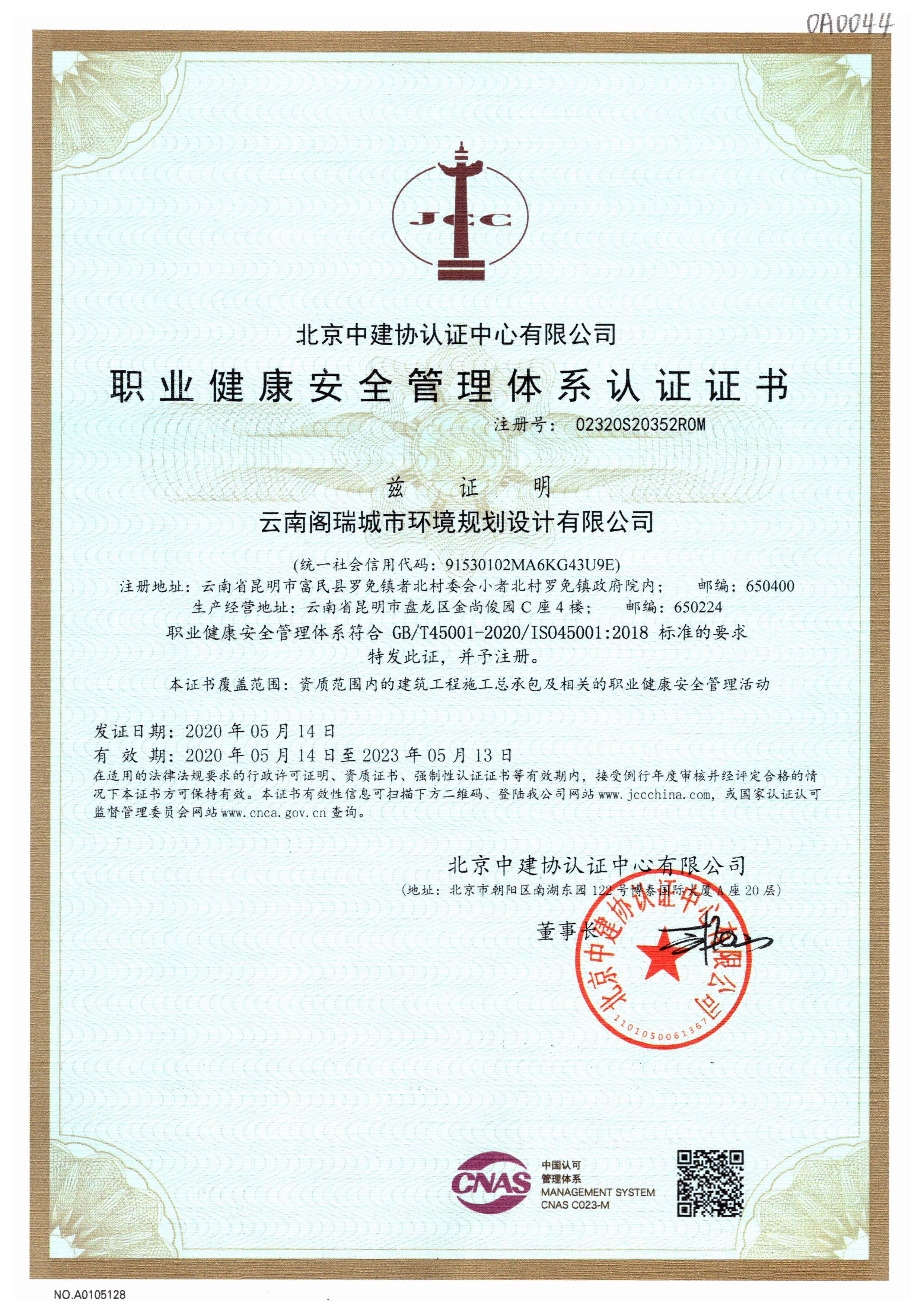 【閣瑞建筑】職業(yè)健康安全管理體系認證證書正本